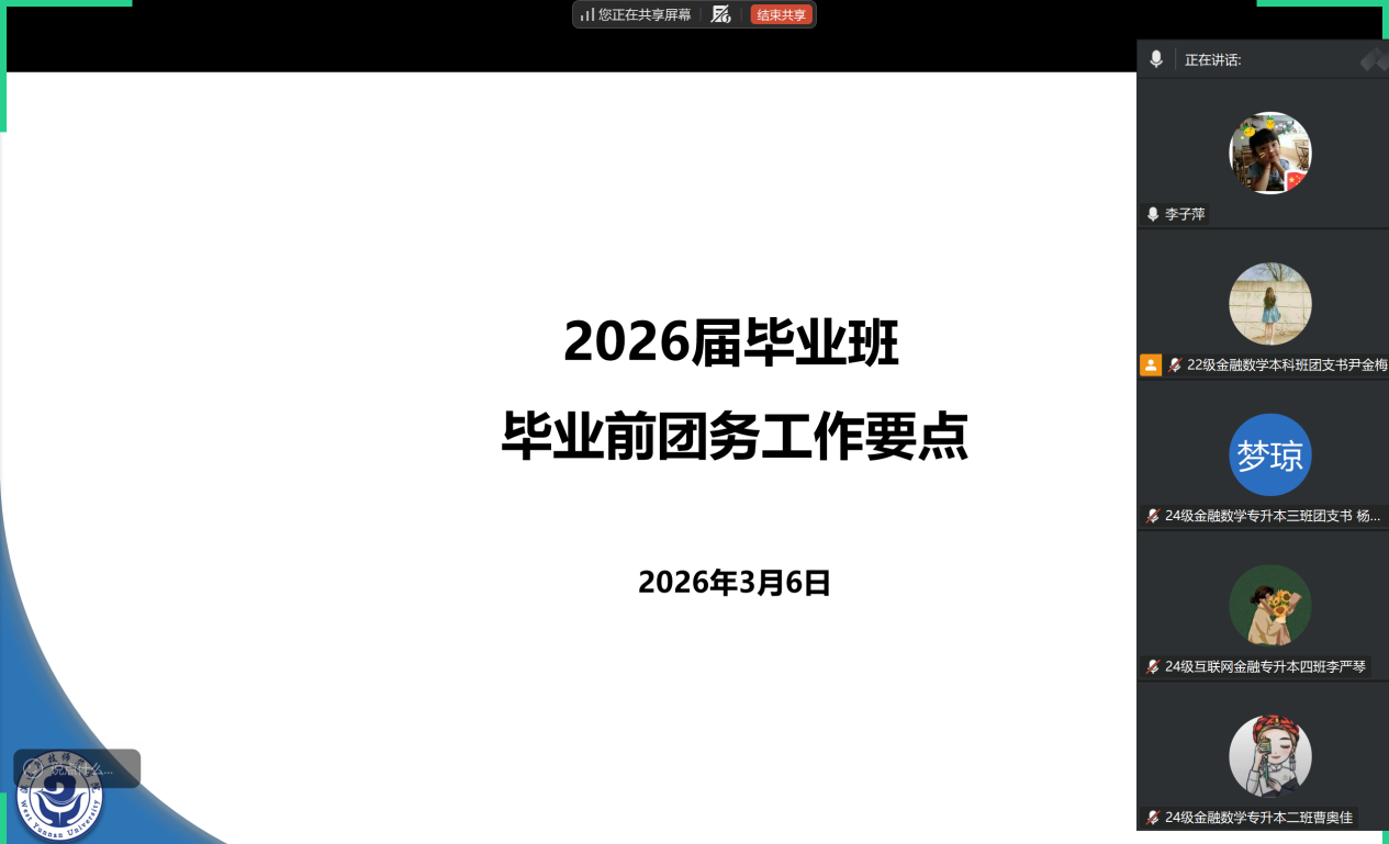 为扎实推进2026届毕业班团务工作落地落实,规范毕业生团籍管理,统筹做好毕业前各项团务工作,3月6日,数学与数字经济学院组织召开2026届毕业班团支书工作会议。会议由学院党总支纪检委员、团总支书记李子萍主持,全体毕业班团支书参加。