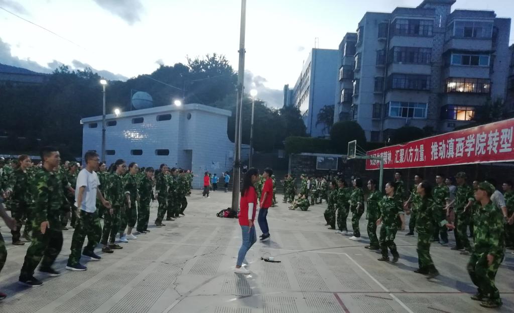 数理学院18级新生民族舞课间操教学活动于9月9日晚上在灯光球场展开,本次教学活动由我院11名舞蹈教官指导,团总支学生会负责人协助指导。