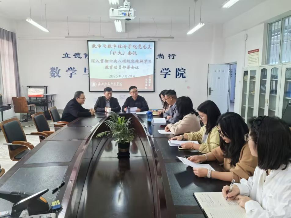 会议传达学习习近平总书记关于深入贯彻中央八项规定精神学习教育的重要讲话和重要指示精神以及中央、省委关于深入贯彻中央八项规定精神学习教育工作的有关会议精神和学校党委《关于在全校开展深入贯彻中央八项规定精神学习教育的实施方案》等文件精神,审议通过《数学与数字经济学院深入贯彻中央八项规定精神学习教育的实施方案》,正式启动学院深入贯彻中央八项规定精神学习教育。