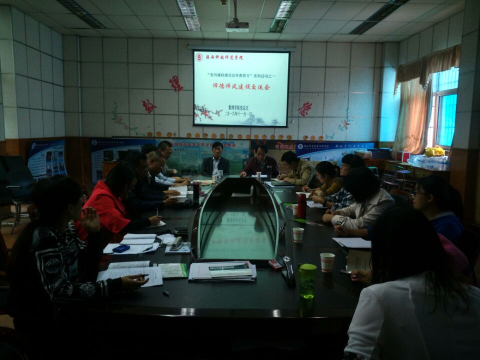(文\杨丕华 图\王丽美)11月1日下午,数理学院党总支在院会议室举办师德师风建设交流会,学院党总支书记王东云副教授、院长陈文华教授和无课教师参加了交流会,院党总支王东云书记主持会议。