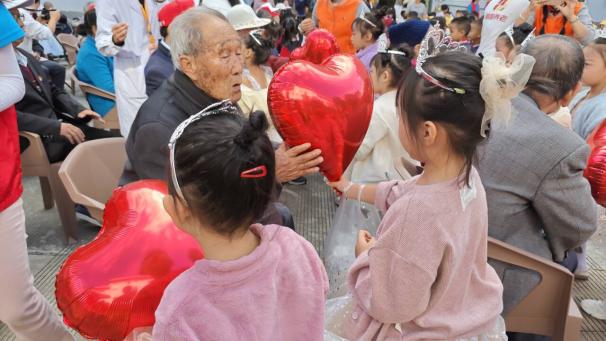 随后,志愿者和小朋友们给爷爷奶奶们送上节日小礼物,表达祝福与敬意。其中,有两位奶奶在当天是大寿,志愿者们为两位奶奶送上了特别的祝福,为奶奶们唱了生日歌并合影留念。