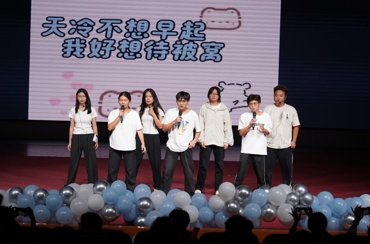 灯光流转间,学院团总支、学生会带来的开场舞率先引爆全场。动感节拍与灵动舞姿交织,将同学们的青春热忱诠释得淋漓尽致,现场气氛持续升温。整场晚会节目多元出彩,既有思想深度,更具青春张力:古典舞《时候》以柔婉舞姿勾勒时光流转;小品《时间都去哪儿了》则用幽默台词叩问时光意义,一舞一剧、一古一今,共同引导新生领悟“珍惜韶华、规划青春”的真谛;独唱《线》《我怀念的》《瞬》与合唱《有何不可》轮番上演,清亮嗓音与真挚情感打动人心,尽显学子多才多艺;舞蹈《爱乐之城》复刻经典浪漫,舞蹈《A.D.N》燃动全场节奏,双人舞《you and me》诠释默契与柔美,每一段舞姿都绽放着青春的鲜活与热烈。