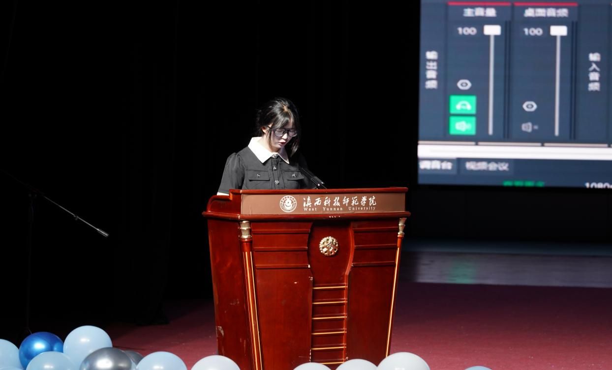 晚会开始,学院党总支副书记朱国卫老师登台致辞,他以热忱的话语欢迎2025级新生加入学院大家庭,更寄予深切期许:“愿同学们在这里筑牢数理根基,勇探数字蓝海,将个人理想嵌入时代发展脉络,用智慧与实干‘经响’属于自己的美好未来。”随后,2025级新生代表苏霖霞上台发言,她以真挚的语气分享了初入学校的感受,从初见校园的好奇,到接触专业课程的期待,字里行间满是对大学生活的憧憬。发言完毕,全场掌声雷动,晚会正式拉开帷幕。