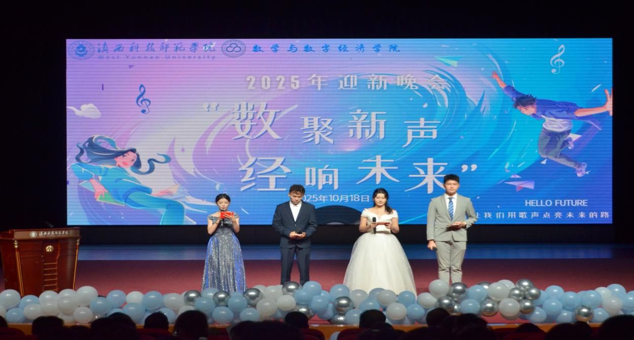 秋夜星光璀璨,青春乐章奏响。10月18日19:00,数学与数字经济学院2025年“数聚新声 经响未来”迎新晚会在学校综合会堂举行。学院领导、教师代表与全体新生欢聚一堂,共同观看了这场精彩纷呈的视听盛宴。